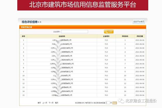 進一步完善造價咨詢企業(yè)信用評價體系,每日動態(tài)更新各企業(yè)信用評分,在北京市住建委市場信用信息監(jiān)管服務(wù)平臺予以公布。