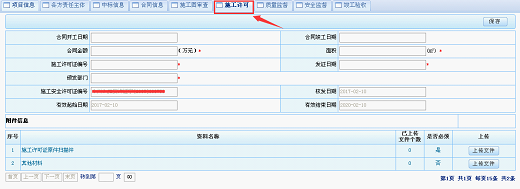 施工許可:如建設(shè)單位已通過“四川省建筑市場監(jiān)管與誠信信息一體化工作平臺”申報施工許可并經(jīng)由建設(shè)主管部門審批通過,則此處將自動同步數(shù)據(jù)庫中數(shù)據(jù),企業(yè)無需填報。如“施工許可”欄目中沒有數(shù)據(jù),則企業(yè)需依據(jù)該項目施工許可證具體內(nèi)容自行填寫對應(yīng)信息,并上傳施工許可證原件掃描件或主管部門出具的同意開工證明材料(圖15所示)。
