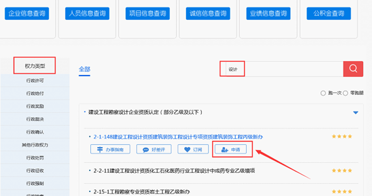 以設(shè)計企業(yè)登錄為例,在以上前兩個頁面先后點擊“直通部門”、“住房城鄉(xiāng)建設(shè)廳”,然后在第三個頁面搜索具體的資質(zhì)類辦理事項關(guān)鍵字“設(shè)計”,最后點擊【申請】按鈕并在第四個頁面確認(rèn)業(yè)務(wù)類型為“設(shè)計”后,進(jìn)入設(shè)計企業(yè)版如下圖所示: