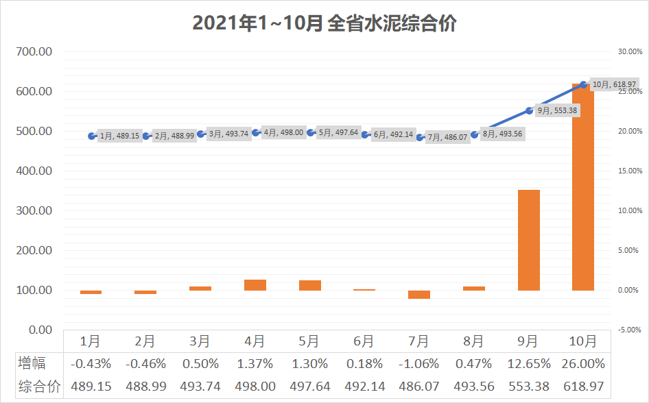 水泥價格在今年9月前,價格幾乎未變,8月中旬由于廠商集體漲價,導致9月綜合價出現(xiàn)較大幅度的上漲,至10月對比20年12月價格漲幅已達26%。