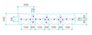 【例】某水泥攪拌墻(圖-1),采用三軸攪拌樁施工(圖-2),樁徑為850mm,樁軸(圓心)矩為600mm,樁長(zhǎng)10m,水泥摻量20%,計(jì)算該水泥攪拌墻工程量并執(zhí)行消耗量標(biāo)準(zhǔn)。