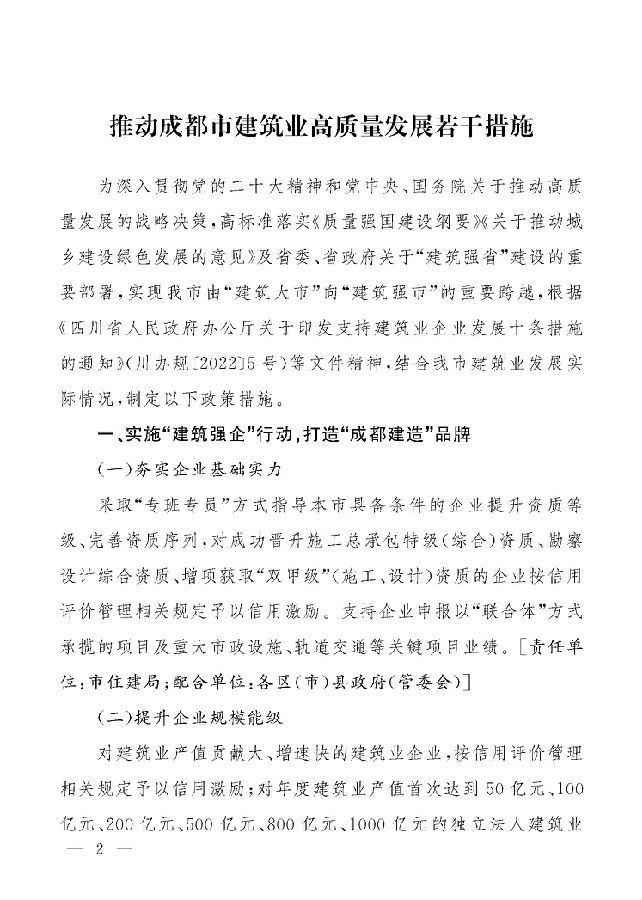 【政策通知】成都市人民政府辦公廳關(guān)于印發(fā)推動(dòng)成都市建筑業(yè)高質(zhì)量發(fā)展的若干措施的通知