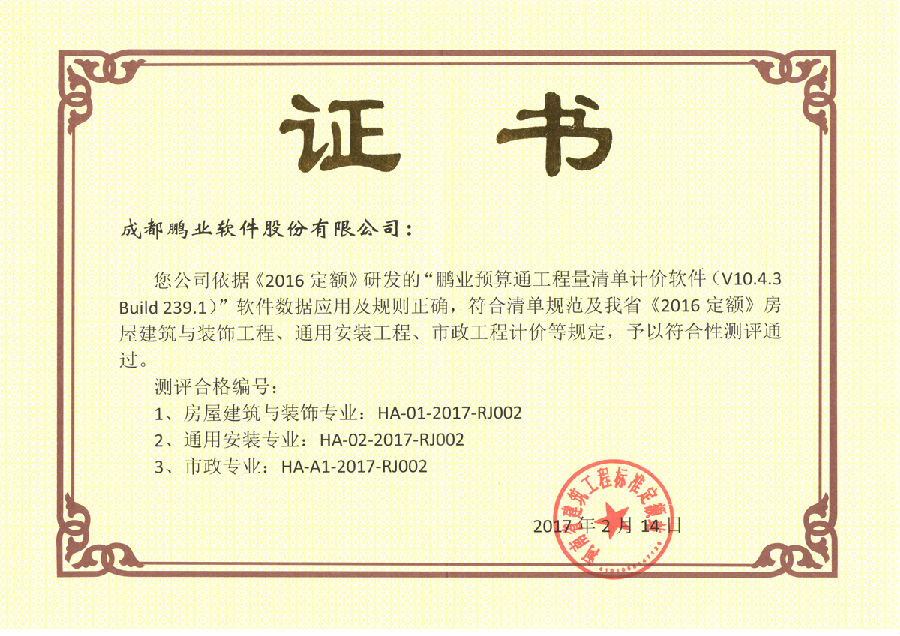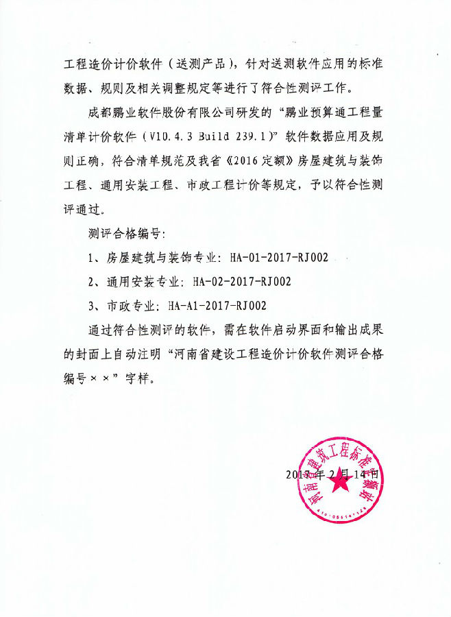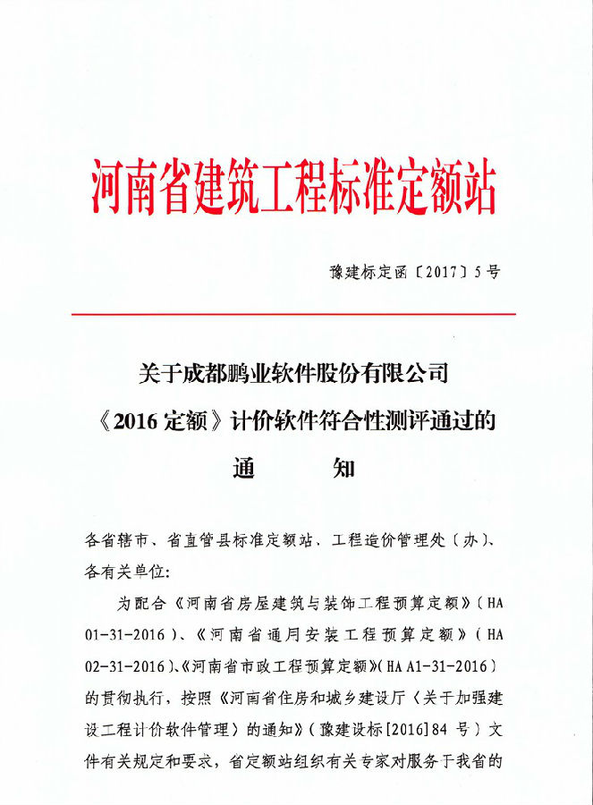 河南省建筑工程標(biāo)準(zhǔn)定額站關(guān)于成都鵬業(yè)軟件股份有限公司《2016定額》計(jì)價(jià)軟件符合性測評通過的通知