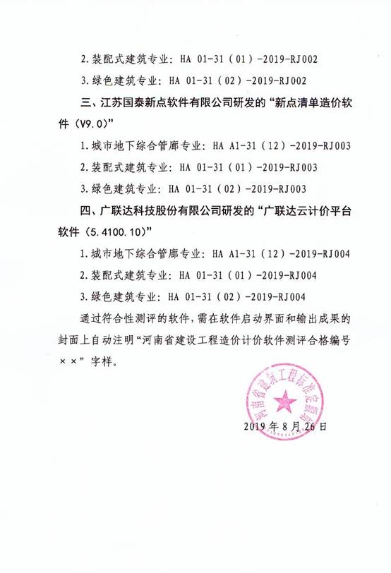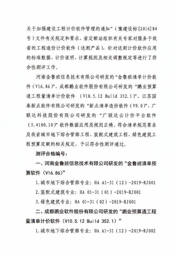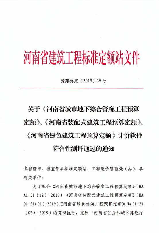 關(guān)于《河南省城市地下綜合管廊工程預(yù)算定額》、《河南省裝配式建筑工程預(yù)算定額》、《河南省綠色建筑工程預(yù)算定額》計價軟件符合性測評通過的通知