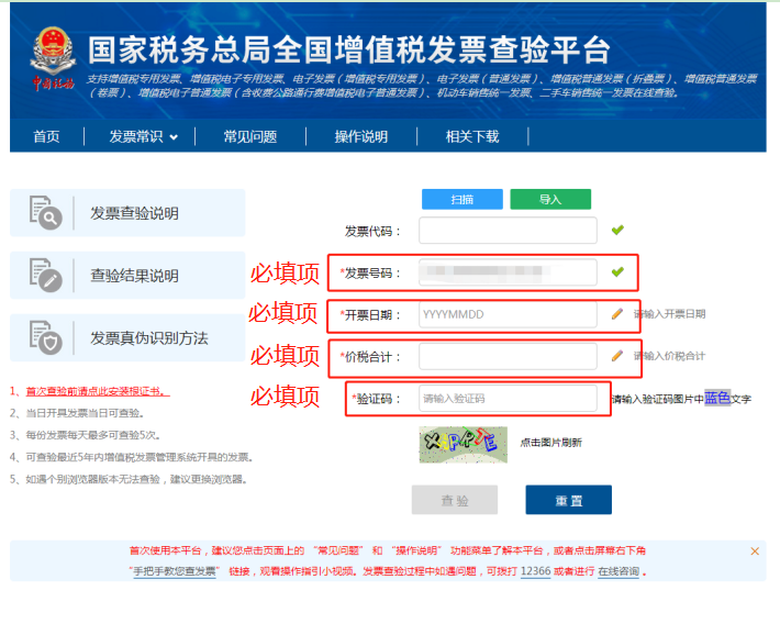 第三步:在紅框處輸入對應(yīng)發(fā)票信息,點擊“查驗”即可。