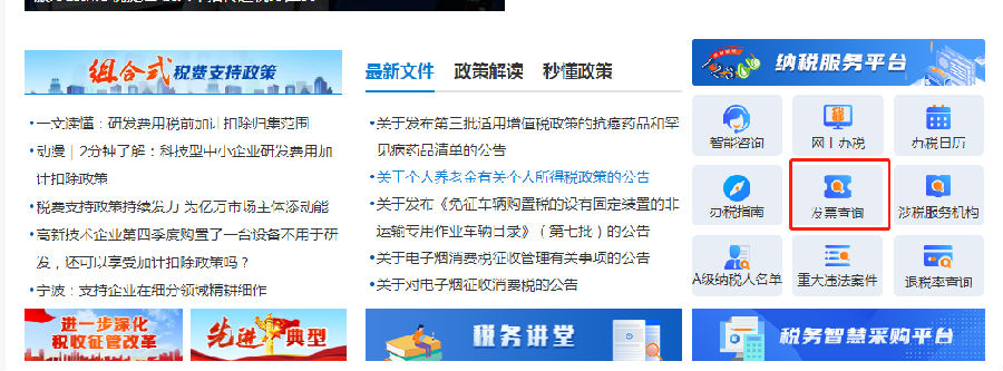 第二步:首頁向下滑動,找到“納稅服務(wù)平臺”模塊,點擊“發(fā)票查詢”進入國家稅務(wù)總局全國增值稅發(fā)票查驗平臺。