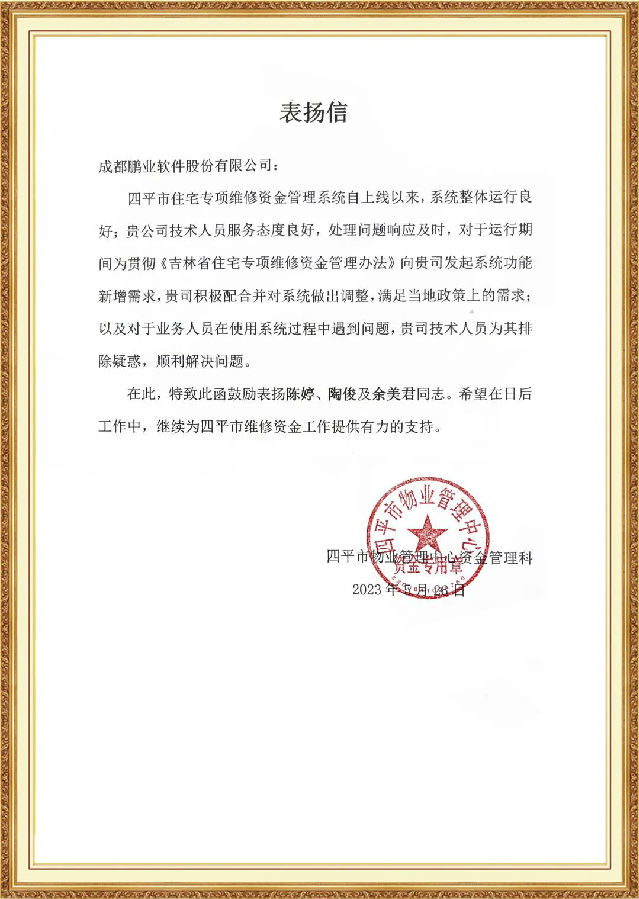 時隔不久,鵬業(yè)再次收到表揚(yáng)信,此封來自四平市物業(yè)管理中心資金管理科發(fā)來的信,稱贊陳婷、陶俊、余美君服務(wù)態(tài)度良好、處理問題響應(yīng)及時,并對其專業(yè)能力和敬業(yè)精神給予了高度的肯定。