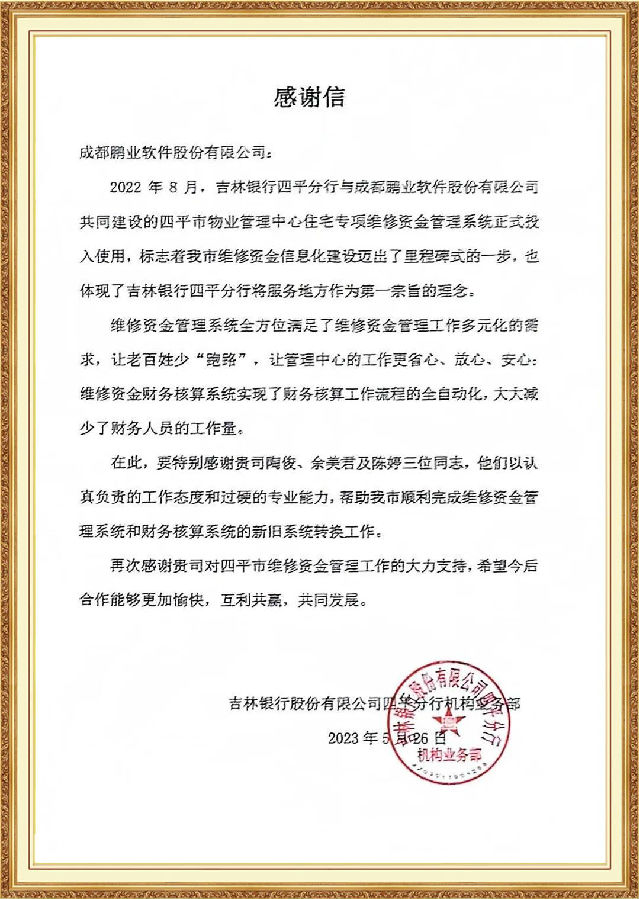 同時,在四平市維修資金管理系統(tǒng)和財務(wù)核算系統(tǒng)的新舊系統(tǒng)轉(zhuǎn)換工作中,陳婷、陶俊、余美君積極響應(yīng)多元化的管理需求,配合完成系統(tǒng)升級轉(zhuǎn)換,獲得了吉林銀行四平分行真誠的感謝。