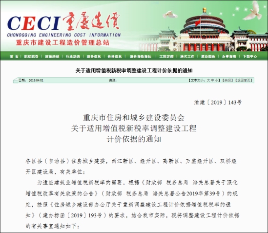 二、渝建〔2019〕143號(hào) 重慶市住房和城鄉(xiāng)建設(shè)委員會(huì)關(guān)于適用增值稅新稅率調(diào)整建設(shè)工程計(jì)價(jià)依據(jù)的通知
