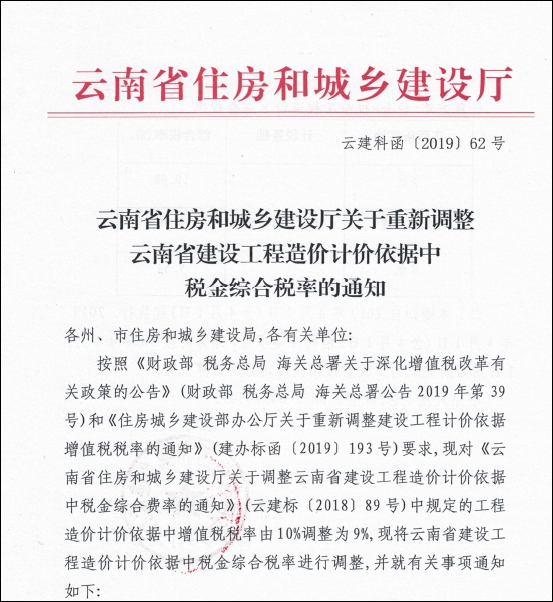 五、云建科函【2019】62號(hào) 云南省住房和城鄉(xiāng)建設(shè)廳關(guān)于重新調(diào)整云南省建設(shè)工程造價(jià)計(jì)價(jià)依據(jù)中稅金綜合稅率的通知