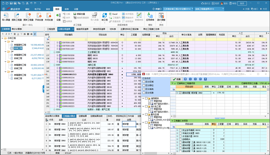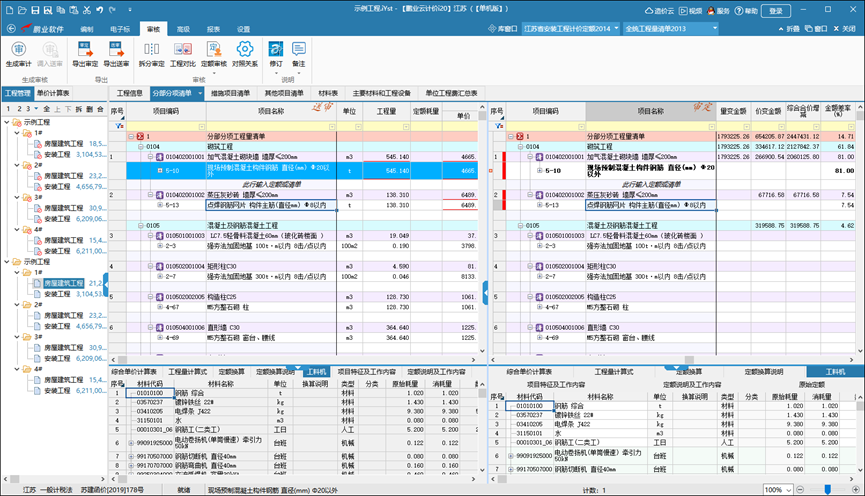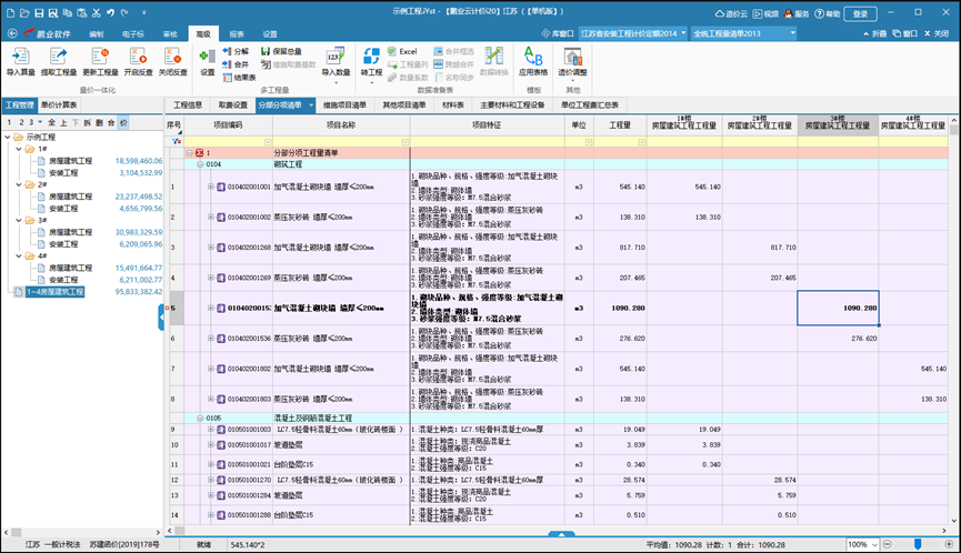 對于大型群樓工程,會(huì)涉及到多個(gè)單位工程中項(xiàng)目相同但工程量不同的情況,為了減少用戶工作量,可以便捷的對工程項(xiàng)目進(jìn)行統(tǒng)一清單開項(xiàng),在一個(gè)界面中實(shí)現(xiàn)多個(gè)單位工程組價(jià)一次性完成,保證同一項(xiàng)目單價(jià)一致,方便查看工程量指標(biāo)和經(jīng)濟(jì)指標(biāo),避免重復(fù)操作,極大的降低人力、時(shí)間成本。