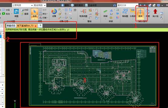 3. 圖紙調(diào)進(jìn)去之后,進(jìn)入到系統(tǒng)的主界面,本軟件采用一鍵識(shí)別的功能處理噴淋系統(tǒng)。選擇下圖中位置1的一鍵識(shí)別噴淋按鈕,每次操作都會(huì)出現(xiàn)圖中2位置的提示。按照提示選擇識(shí)別的區(qū)域,選擇圖中3位置的圖紙區(qū)域,單擊,進(jìn)入噴淋模型界面。