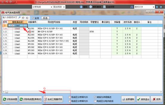 4. 進(jìn)入電氣系統(tǒng)圖信息界面,勾選相應(yīng)的配電箱1,單擊生成工程量2.如下圖。