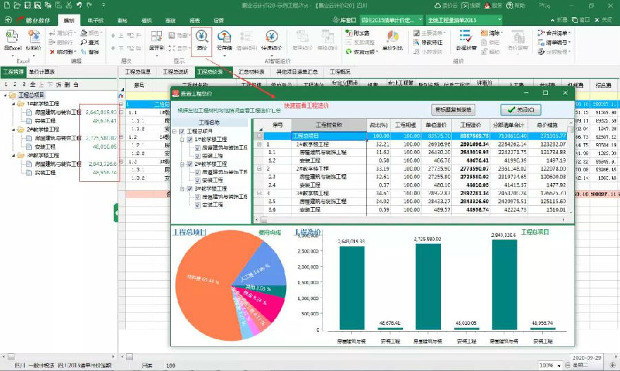 工程目錄結(jié)構(gòu)樹,顯示各單位工程造價(jià);點(diǎn)擊【造價(jià)】功能,從不同維度快速統(tǒng)計(jì)、分析造價(jià)占比。如圖示: