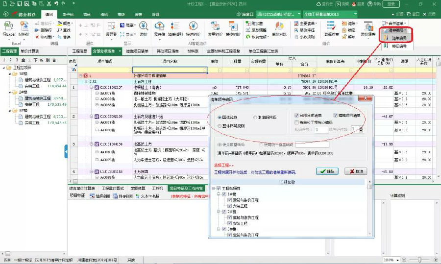 工程編制完成后,一般都需要按照清單規(guī)范要求進(jìn)行編號(hào),以滿足編制要求進(jìn)行清單項(xiàng)目增加順序碼和編號(hào)。如圖示: