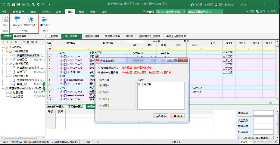 針對大清單數(shù)據(jù)進行專業(yè)化結(jié)構(gòu)管理,然后根據(jù)自定義的標(biāo)簽管理拆分工程,滿足任意多專業(yè)工程結(jié)構(gòu)化管理需求。使得造價管理專業(yè)人員工作更加高效。如圖示: