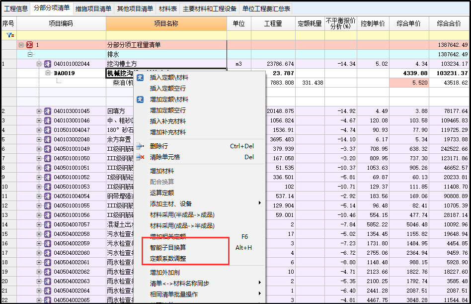 云計價i20針對“定額系數(shù)調(diào)整、定額增減換算”進行功能整合,換算依據(jù)更加清晰,實時查詢定額換算信息。如圖示: