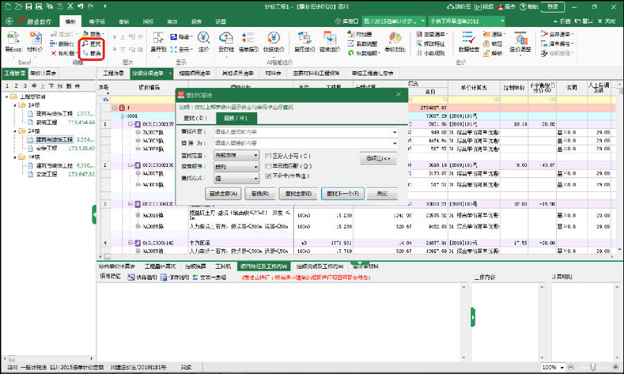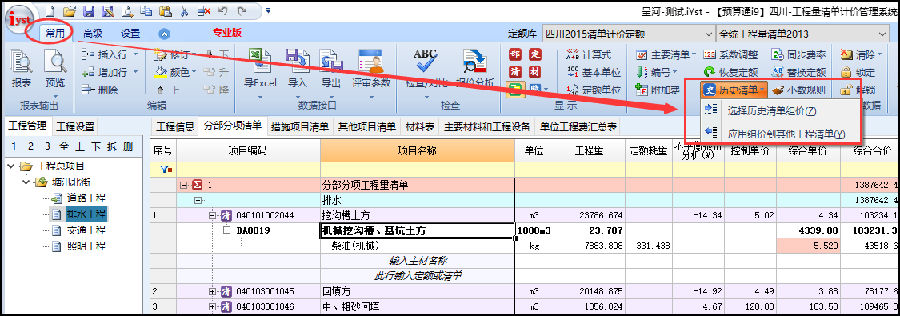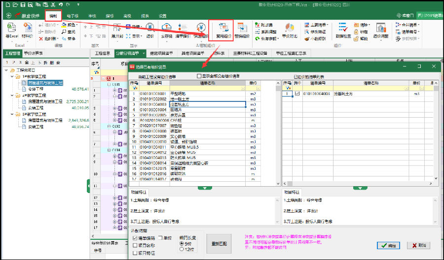 針對相似、相近清單項目,復(fù)用或替換組價定額。將工程的清單組價數(shù)據(jù)應(yīng)用到當(dāng)前工程中,或?qū)?dāng)前工程組價數(shù)據(jù)應(yīng)用到同一工程的其他清單項目。如圖示: