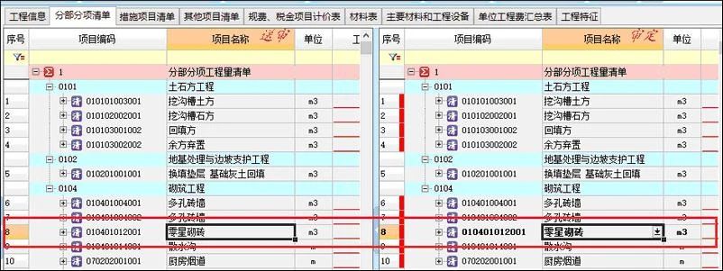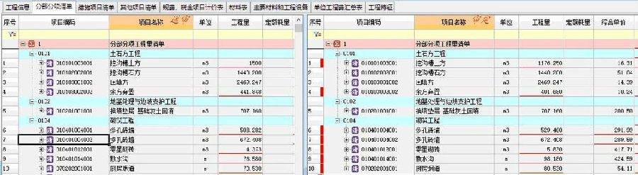 ① 分別點(diǎn)擊送審工程(左側(cè))與審定工程(右側(cè))的清單項(xiàng)目,將光標(biāo)停留在對(duì)應(yīng)的清單上;