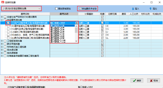 ⒉、若勾選“按定額條件計取”選項(xiàng),則自動按定額號條件智能判斷并計取附加費(fèi);不勾選則強(qiáng)制對當(dāng)前項(xiàng)及子項(xiàng)按選擇附加費(fèi)內(nèi)容計取。