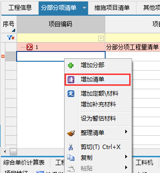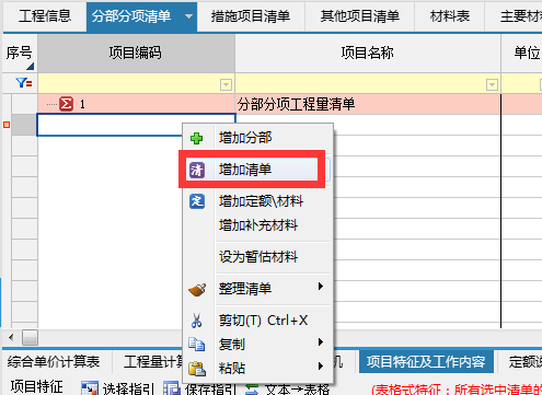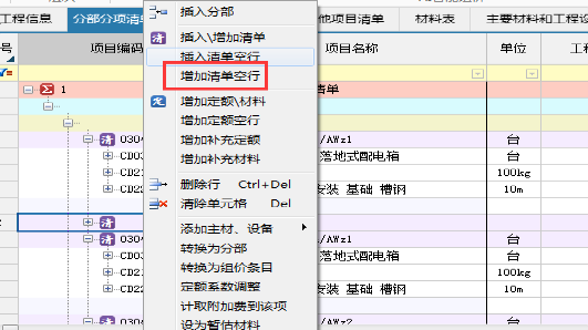 定位在已有清單或分部行,點擊鼠標右鍵選擇增加清單空行,輸入清單編碼,例:房屋建筑與裝飾工程,01B001開始,然后輸入清單項目名稱,單位,項目特征及工作類容等