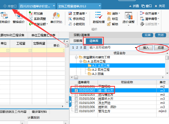 2、進入庫,上方勾選清單,下面勾選定額,勾選好后選擇插入或后增方式進行清單和定額的錄入