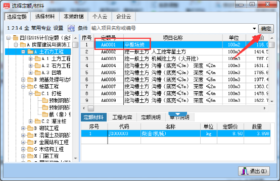 2、選擇相對應定額,然后點確定,完成定額錄入