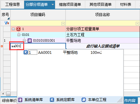 方式2:直接輸入定額編號,如輸入AA1--完成定額錄入;