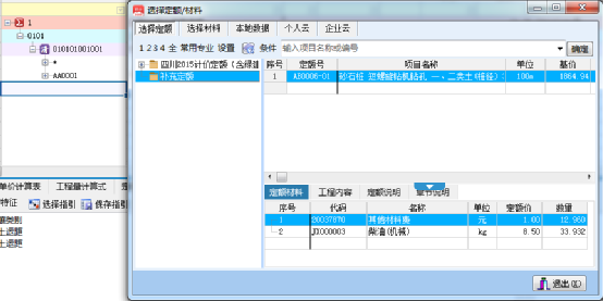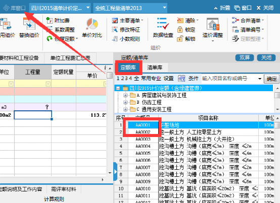 方式3:通過庫窗口選擇定額,找到對應定額,雙擊進行定額錄入;