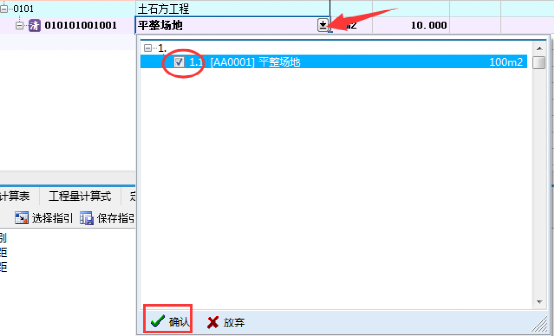 方式4:清單指引:鼠標點到清單項目名稱處向下箭頭--勾選相應定額--確定,進行定額錄入。