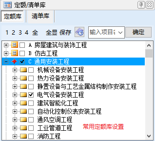 “設置”功能用于設置常用定額庫,點擊按鈕后名稱變?yōu)椤氨4妗?,勾選需設置為常用的定額庫,點擊保存即可,如下圖所示: