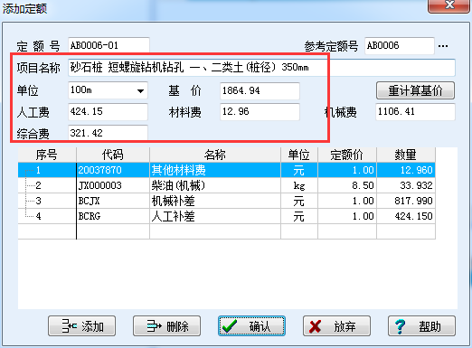 方式1(臨時補充定額):在分部分項清單表中的清單上點擊鼠標右鍵增加補充定額,補充定額需要自行輸入定額編碼(定額編碼需以“ * ”或 ”補“字開頭),名稱,工程量,單位,價格