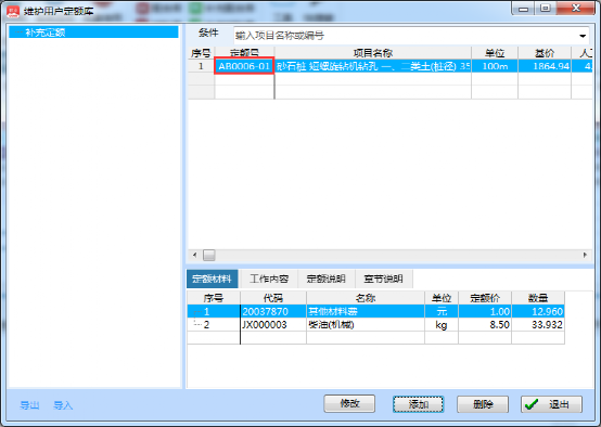 補充定額庫里面的定額可以導出和導入。方便在其他電腦上使用(注:補充定額庫導入軟件后,需要重啟軟件才能看見)