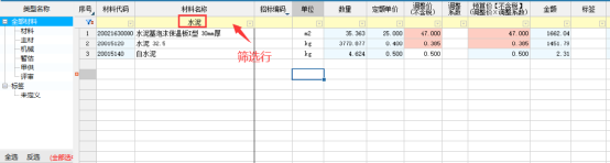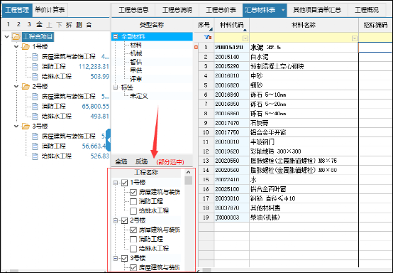 匯總材料表可以對整個(gè)工程的材料進(jìn)行匯總統(tǒng)計(jì),也可查看某幾個(gè)工程的材料數(shù)據(jù),通過匯總材料表左下方勾選需要統(tǒng)計(jì)的工程即可: