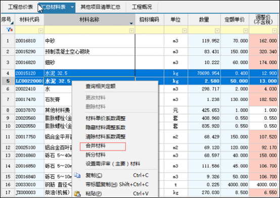 材料合并:在編制造價(jià)文件時(shí),一個(gè)項(xiàng)目可能是由多人共同完成的,項(xiàng)目合并在一起的時(shí)候可能會(huì)出現(xiàn)有相同的材料,需要對相同的進(jìn)行合并。