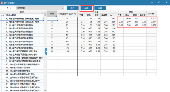 (2)在管件價(jià)格維護(hù)里面輸入相應(yīng)規(guī)格材料的單價(jià)并保存。