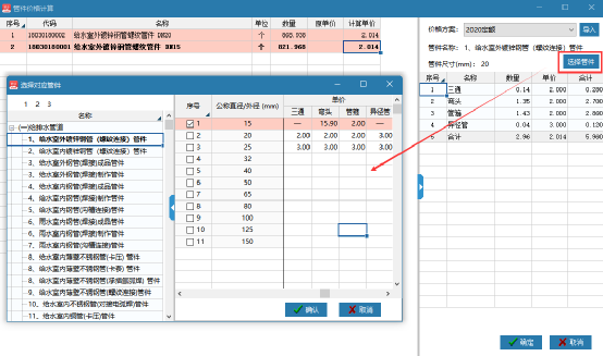 (3)在管件價(jià)格計(jì)算里除了軟件會(huì)自動(dòng)匹配相應(yīng)的管件價(jià)格外,還可以手動(dòng)點(diǎn)擊選擇管件勾選相應(yīng)的價(jià)格進(jìn)行調(diào)價(jià)。
