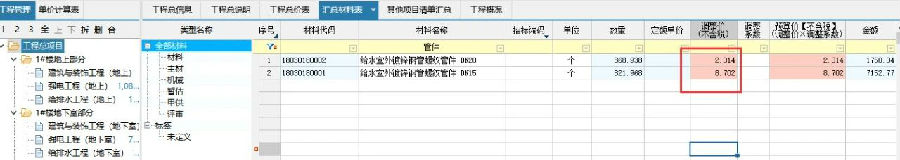 (3)在匯總材料表里選中需要應(yīng)用管件價(jià)格的材料并在工具欄點(diǎn)擊管件價(jià)格-管件價(jià)格應(yīng)用。
