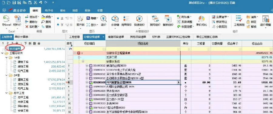 1.點擊編制-“合并清單”按鈕,將所有相同項目清單進行合并。
