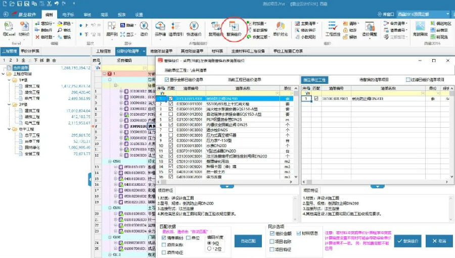 4.如果是投標或招標,可在合并清單的工程里進行組價或修改,然后采用“替換組價”,可批量的進行相同清單項目進行組價。