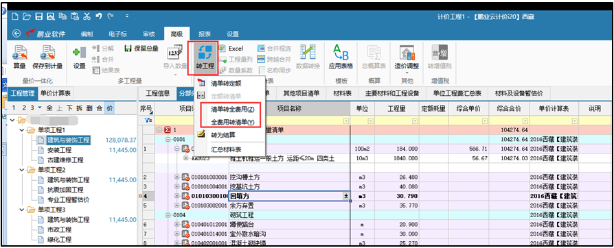 二、新增“高級——轉(zhuǎn)工程——清單轉(zhuǎn)全費用、全費用轉(zhuǎn)清單”功能。