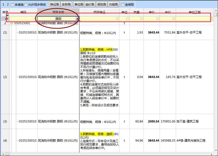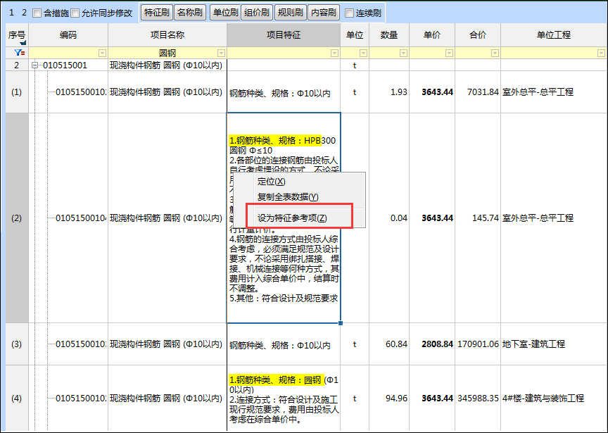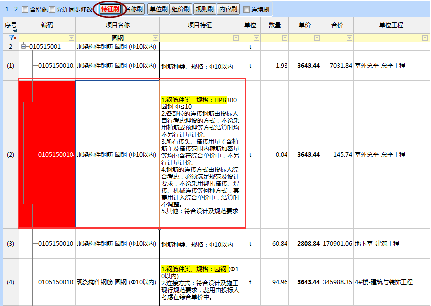 在整個項目造價編制過程中,快速對相同清單項的單價、項目名稱、項目特征等進行對比檢查,通過格式刷方式對特征、名稱、單位等內(nèi)容快速修改,保障相同清單在一個項目里只有唯一的報價。