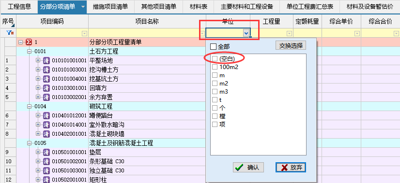 四、如果清單存在多單位,選擇清單時(shí)需要確定一個(gè)單位。