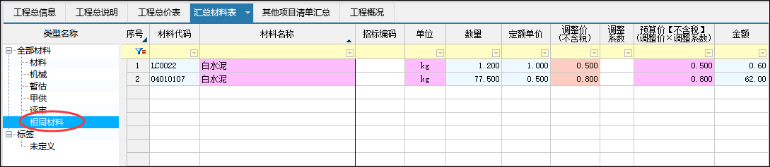 六、匯總材料表新增“相同材料”分類(lèi),相同材料指代的是名稱(chēng)、單位一致,但代碼、定額單價(jià)、調(diào)整價(jià)等有差異的材料,方便快速查找相同材料的差異。