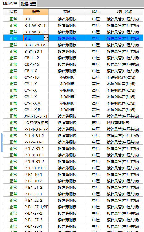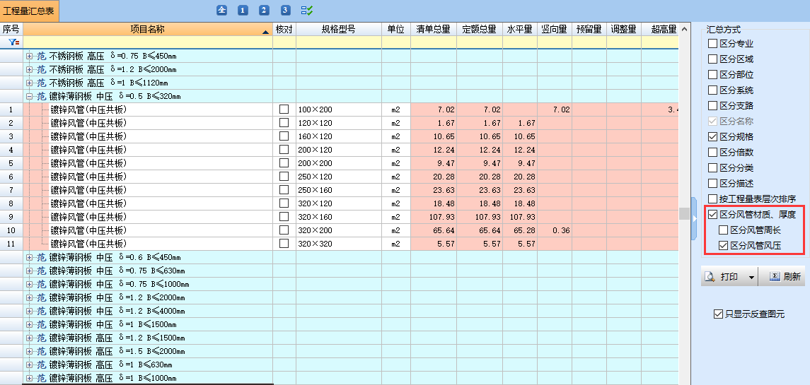 匯總表中按照各系統(tǒng)所設(shè)置的風(fēng)管材質(zhì)、風(fēng)壓等級(jí)、大邊長(zhǎng)進(jìn)行厚度的確認(rèn)及工程量的匯總