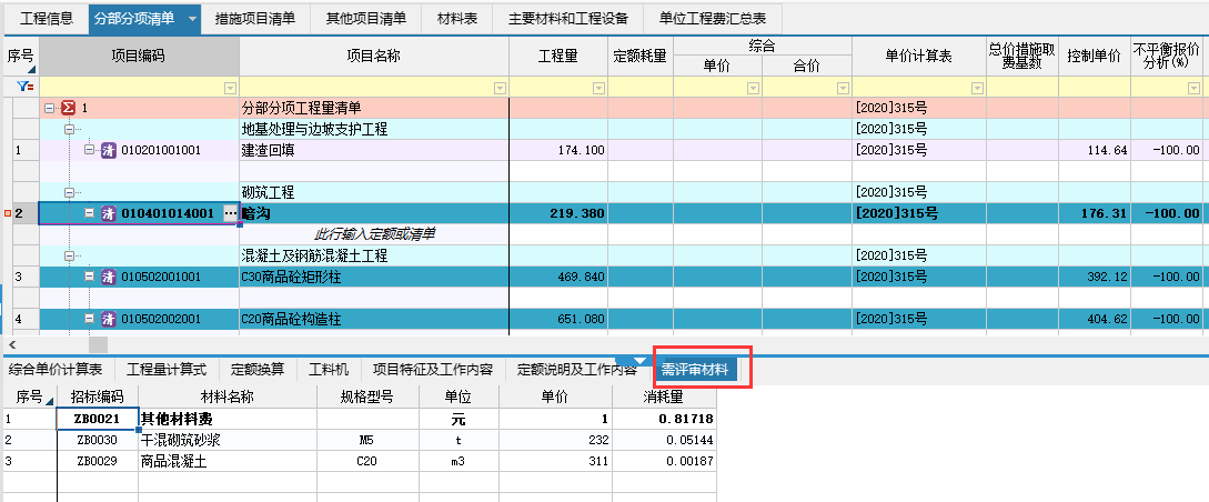 6.在分部分項界面能實時顯示控制單價和組價后的不平衡報價,方便調(diào)整。