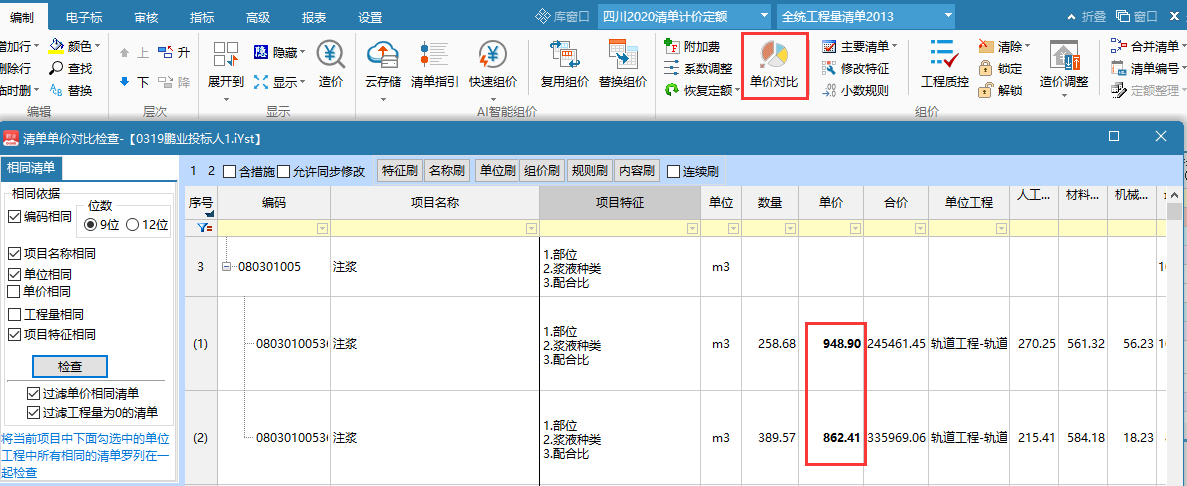 工程編制完成后,通過單價對比功能快速對相同的清單存在不同的單價進行篩選,方便快速調(diào)整。
