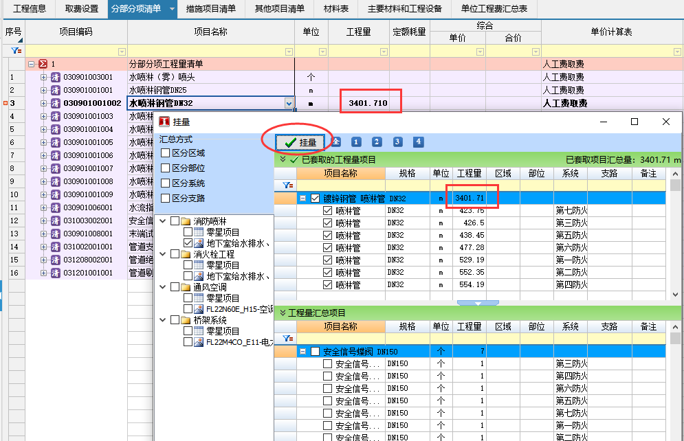 在云計價i20軟件中完成了清單項后,選擇“提取工程量”按鈕,即可對指定清單進行“掛量”操作。