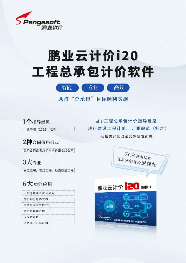 鵬業(yè)云計(jì)價(jià)i20軟件符合工程總承包合同計(jì)價(jià)要求,操作簡單、便捷,大大提升編制效率。為工程總承包項(xiàng)目建設(shè)提供標(biāo)準(zhǔn)化及數(shù)據(jù)服務(wù),助力全省工程總承包計(jì)價(jià)規(guī)范順利實(shí)施!