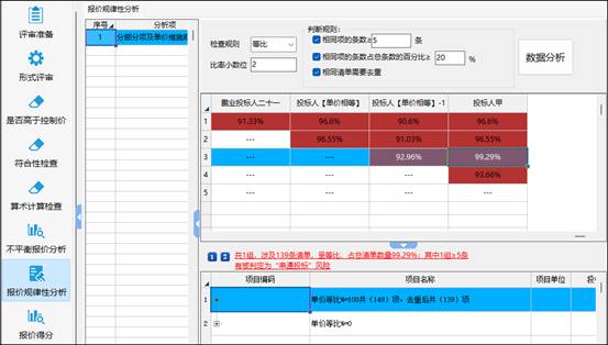 6. 在“報(bào)價(jià)規(guī)律性分析”界面,將會(huì)對(duì)清單單價(jià)規(guī)律性、清單組價(jià)規(guī)律性、材機(jī)規(guī)律性等進(jìn)行數(shù)據(jù)分析,如圖示: